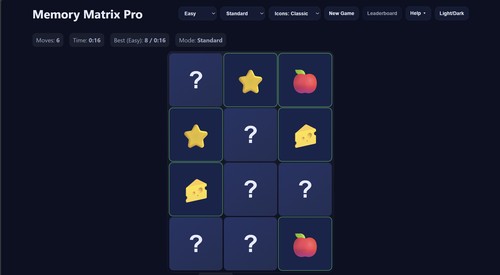 Single-player memory & pattern puzzle. Memorize a brief pattern on a grid, then rebuild it before time runs out. New layouts every round, adjustable difficulty, timer & score. Works offline (airplane mode). No ads, no data collection.